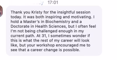 I’m an expat in a foreign country and not only did Kristy help me find out what I want in my career, I also gained a lot of insights into who I am. Kristy also helped me to be more positive about a lot of things through working on my mindset. She has a lot of world knowledge and comes up with many ideas and options which really helped me a lot in my own decision making process.